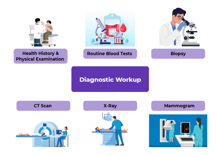 This section provides information on the types of tests and investigations that may be required for you to receive a diagnosis. When deciding what tests to refer you for, your healthcare team will refer to a diagnostic guideline, known as a diagnostic workup. The purpose of this workup is to try to determine whether a cancer is present, where it started, and how far it may have spread as quickly as possible, avoiding unnecessary and repetitive testing. The workup is then used to guide your clinicians next steps, including referral to specialists or further testing if needed.